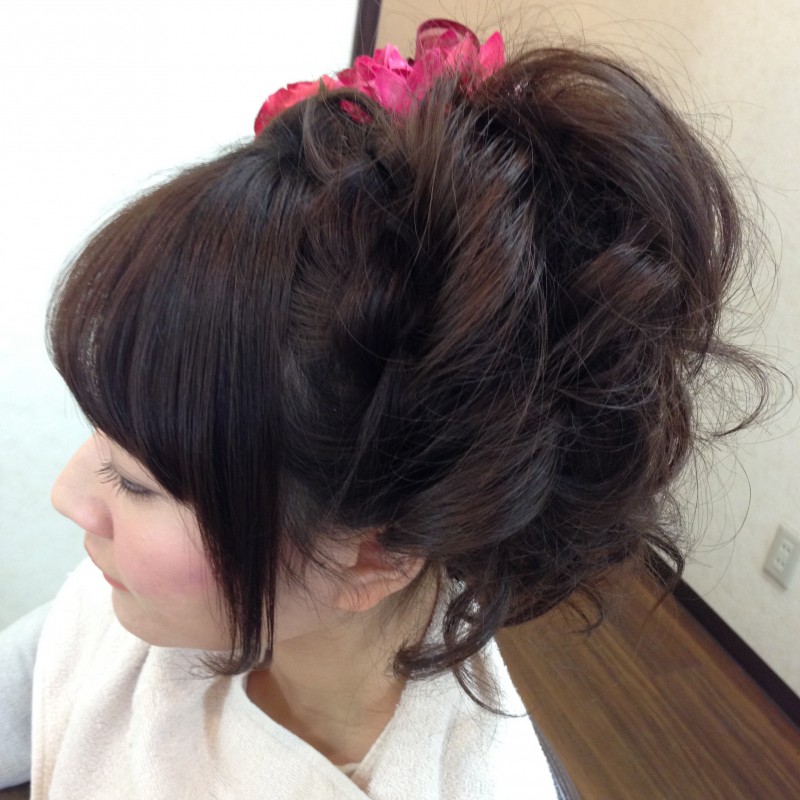 大きな飾りをお持ちだったので、片側にカールが出るようにしました。